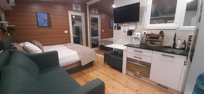 Inside, the tiny home combines modern amenities with stunning natural beauty. The double bed faces a floor-to-ceiling window, offering breathtaking views of the pomegranate orchard right from the comfort of your bed. The home also features efficient heating and cooling, a fully equipped kitchen, a walk-in shower, and a washer/dryer. Stay connected with high-speed WiFi, entertained by the TV and Projector, and enjoy the convenient USB and USB-C outlets. Plus, enjoy free parking for your convenience.